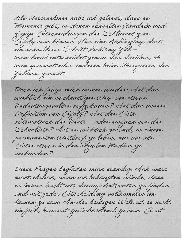 Doch ich frage mich immer wieder: Ist das wirklich ein nachhaltiger Weg, um etwas Bedeutungsvolles aufzubauen? Ist das unsere Definition von Erfolg? Ist der Erste automatisch der Beste – oder einfach nur der Schnellste? Ist es wirklich gesund, in einem permanenten Wettlauf zu leben, nur um als Erster etwas in den sozialen Medien zu verkünden?