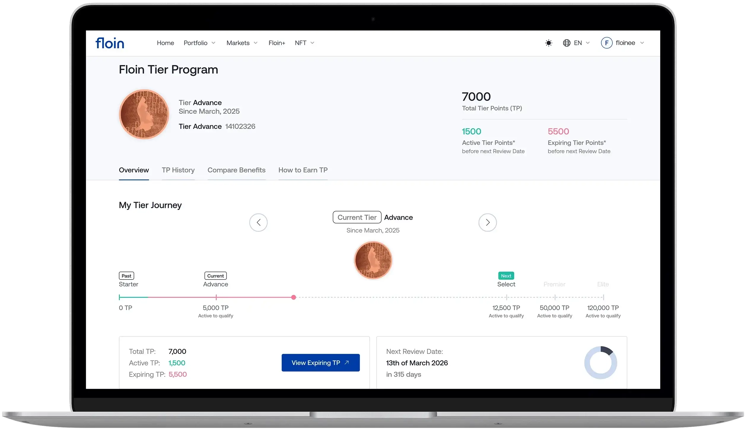 Das Floin Tier-Programm belohnt Dein Engagement und Deine Aktivität mit echten Vorteilen – von exklusivem Zugang zu Floin+ Projekten und speziellen Angeboten bis hin zu Gebührenvergünstigungen und VIP-Support. Je mehr Du teilnimmst, desto mehr schaltest Du frei.