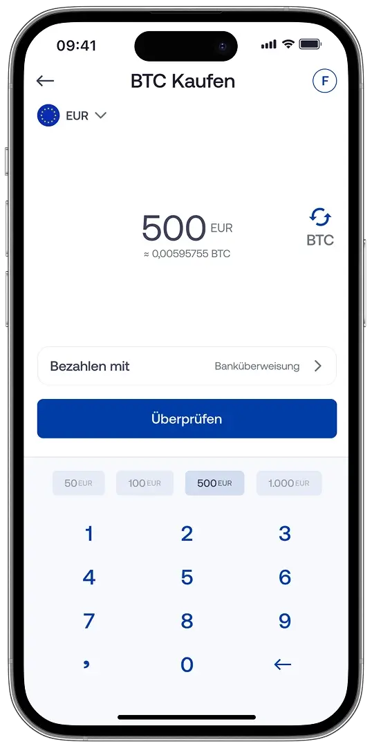 Unsere benutzerfreundliche "Krypto kaufen" Funktion garantiert ein nahtloses Erlebnis und unterstützt verschiedene Zahlungsmethoden, einschließlich Kreditkarten, SEPA-Überweisungen, Apple Pay und Google Pay.